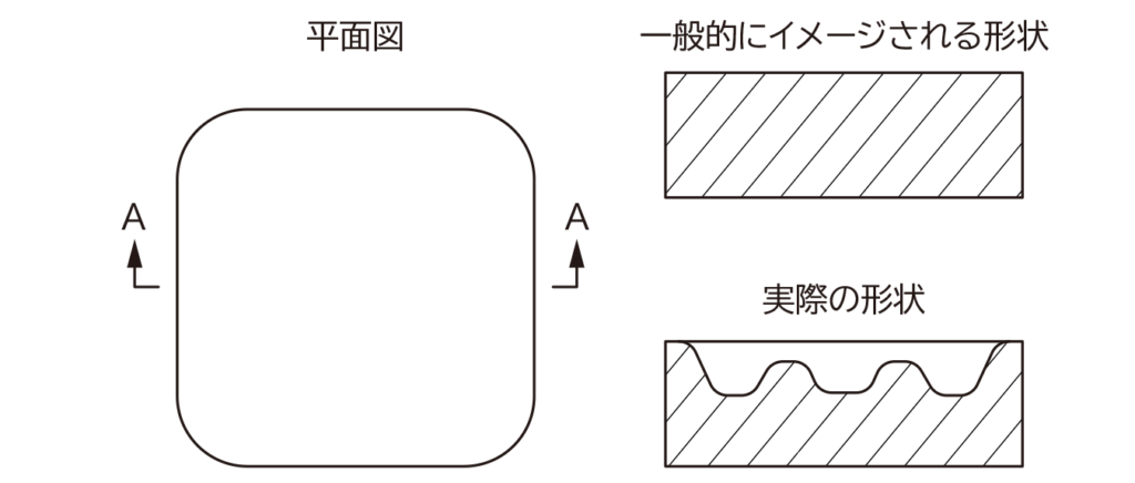 また、製図規定では、形態の角部などの丸みのついたラウンド部分に線は表わさないことになっていますが、そのままでは図面を読む人が意匠権の客体となる形態を正しく理解できない可能性があります。