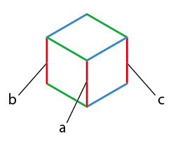 赤の線だけでなく、青の線、緑の線も同様であり、アイソメトリック図の立方体では、すべての辺が同じ長さに描かれています。