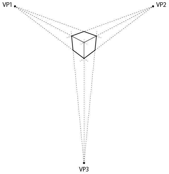 この消失点の位置は作図の際に任意に決めることができますが、描画の対象物と消失点との間隔が遠くなればなるほど収束がゆるくなり、近ければ近いほど収束がきつい(パースがきつい)図になります。